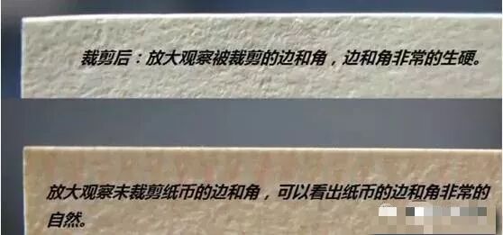 未被裁剪的纸币边和角都非常自然,裁剪后纸币的边和角非常生硬,纸币的角过于尖锐,尤其纸币的角没有“过度”,这种“过度”是永远无法模仿的。但纸币边、角的这种“过度”需要长时间的观察才能体会到其中的奥妙。如下图。