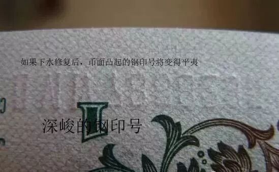 三版人民币中的背绿壹角版,此品种币面的油墨不太明显,但纸币的钢印有立体感,下水修复后币面钢印不再具有明显的立体感。