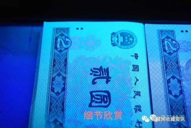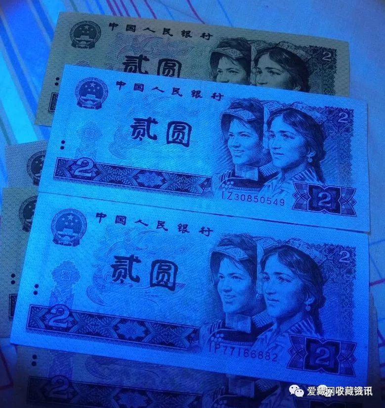清水一般为自来水,自来水与洗衣粉中一般含有荧光漂白剂。经过自来水浸泡或者经过洗衣粉溶液清洗过的纸币,压平晾干后放在紫光灯下就会整体呈现出亮白的荧光效果。原票则仅在有荧光油墨印制的荧光油墨部分才会显现出荧光色。