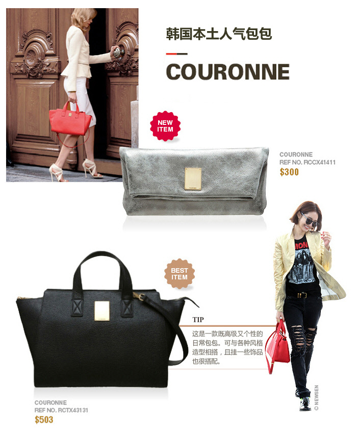 韩国女性们最想拥有的,且因高俊熙的日常包包而有名的COURONNE包包,奢华的皮革与船型的外形具魅力。COURONNE的Stephanie系列女士提包是COURONNE旗下超人气畅销产品,可以说是一款可以背出多样化风格的包包——如果想用作大手提袋(托特包)的话,就可以把包两侧折叠起来收进去,里面的磁铁会将其一下固定住;如果想用作宽松的购物袋的话,就可把两边打开单肩背在身上即可。
