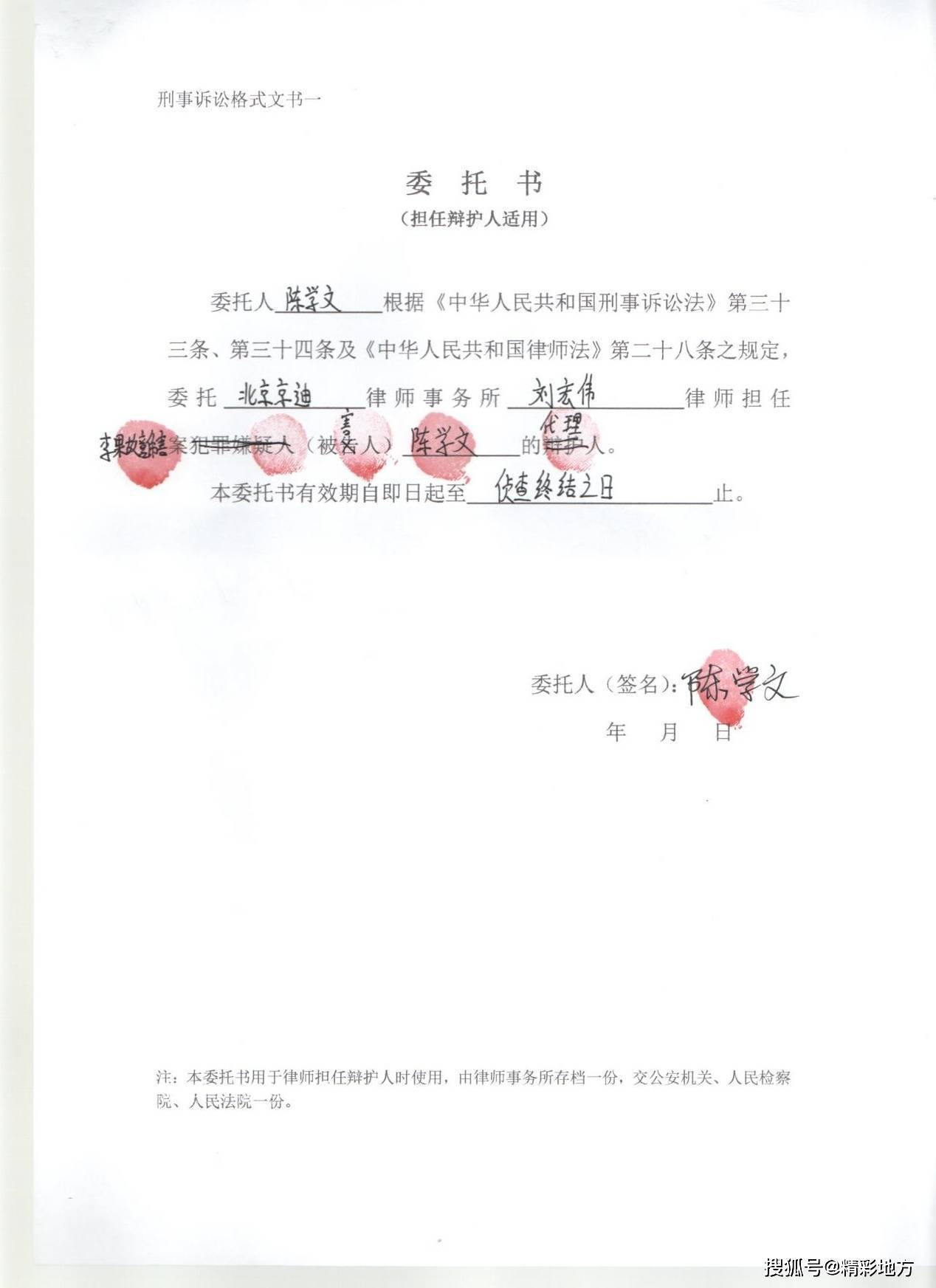 北京京迪律师事务所与2022年1月11日与陈学文(男,贵州省黔西县人,1969年7月7日出生,身份证号:522423196907077055)签署了李*故意伤害案法律帮助的《刑事委托代理协议》《授权委托书》,按照案涉协议第3页“律师代理费5.2条款”陈学文缴纳了5.5万的代理费。本案网上发帖诽谤律师的王发顺和彭景浩是“案外人”不是本案的“委托人”。