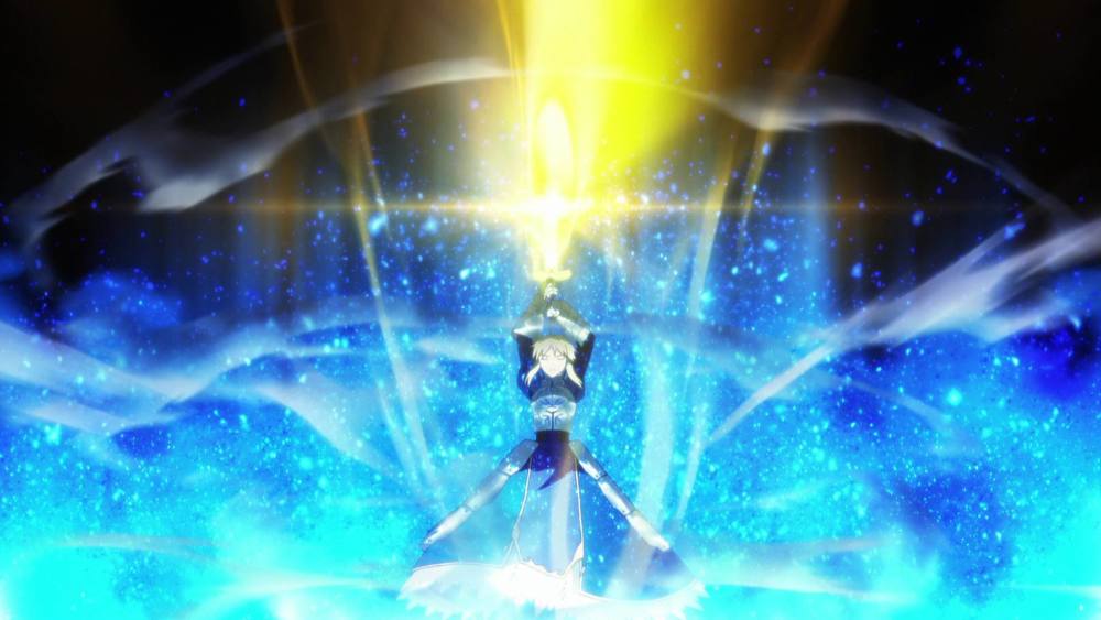 而在二次元世界里,这把剑就成了举次元闻名的SABER的佩剑。在设定里,这把剑是在圣剑此一范畴中立于顶点的剑,是由星球而非人类锻造出的圣剑。以人们的信仰为原料,在星球内部结晶化作为“最强之幻想(Last Phantasm)”的究极神造兵器之一。藉由将所有者的魔力变换成光,再从往下挥的剑的前端如光束一般地放出来破坏万物。在第四次圣杯战争中,曾经一击烧尽由Caster所召唤的身为大海魔的怪物。因其规模与破坏力而被分类为“对城宝具”。