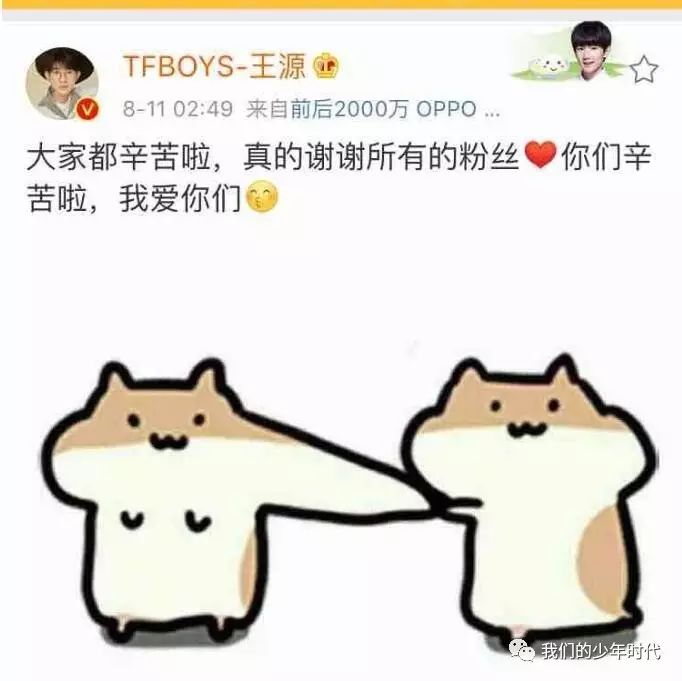 源哥在微博中:大家都辛苦啦,真的谢谢所有的粉丝,你们辛苦啦,我爱你们!当然王艳还带了一个超级可爱的图片,意思就是你喜不喜欢王源的字样的图,那还用说,当然喜欢啦!