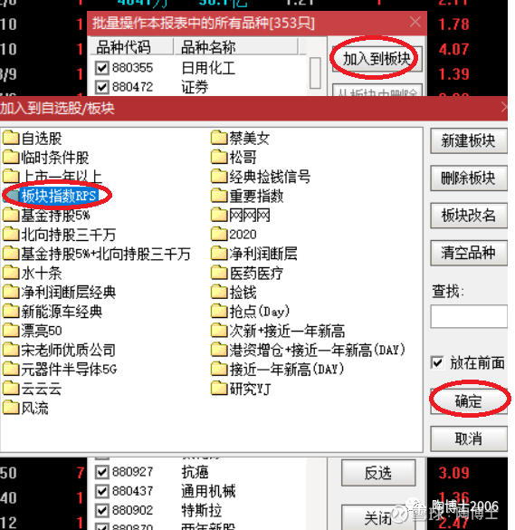 这样,新的自定义板块“板块指数RPS”就建好了。这一步是建立板块指数RPS曲线的必须的第一步。