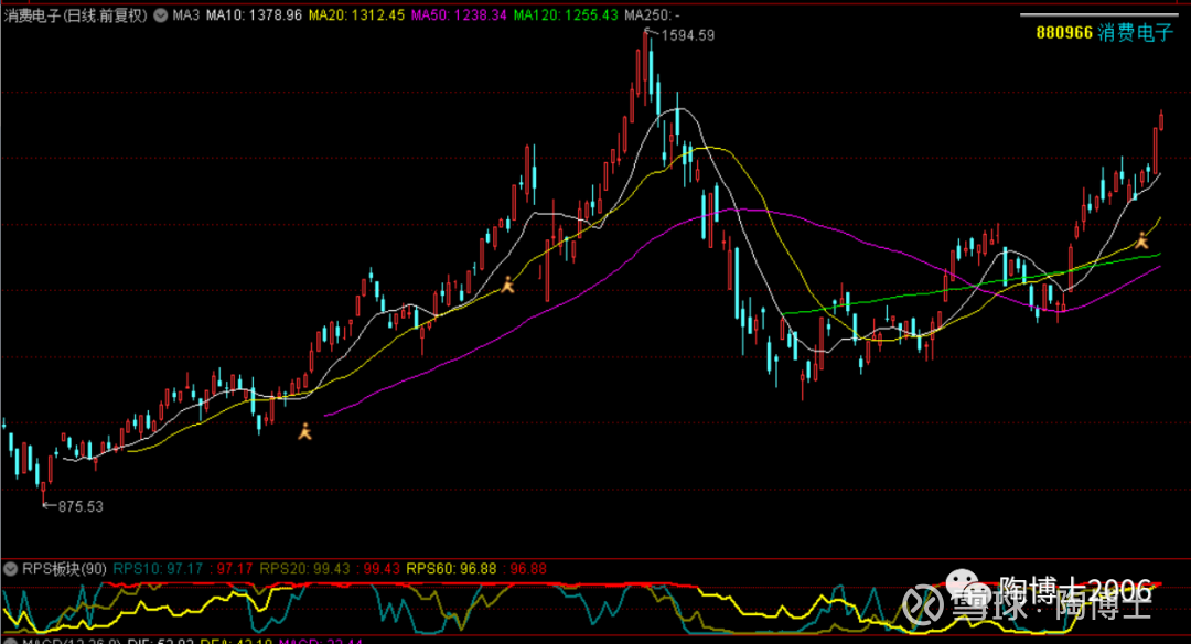 然后在板块指数的K线界面输入:RPS板块。就出现三条RPS曲线了。如消费电子的RPS板块曲线如下图,超过90时,显示为红线,一目了然。
