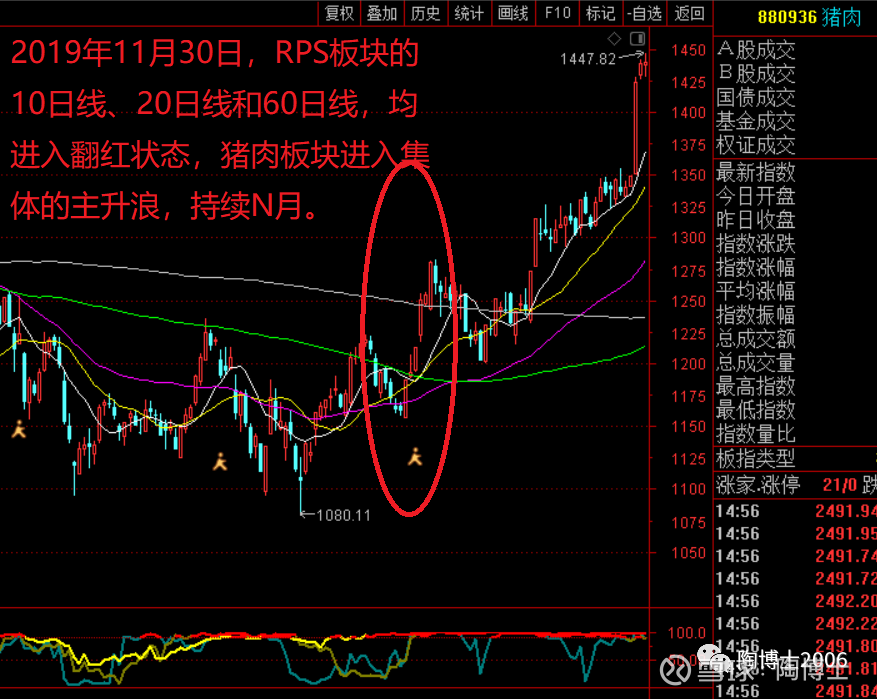 猪肉的板块指数,2019年11月30日,RPS板块的10日线、20日线和60日线,均进入翻红状态,猪肉板块进入集体的主升浪,持续N月。如下图: