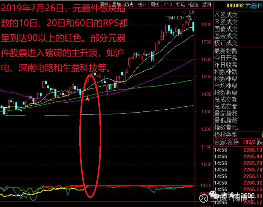 2019年7月26日,元器件板块指数的10日、20日和60日的RPS都呈到达90以上的红色。部分元器件股票进入磅礴的主升浪,如沪电、深南电路和生益科技等。