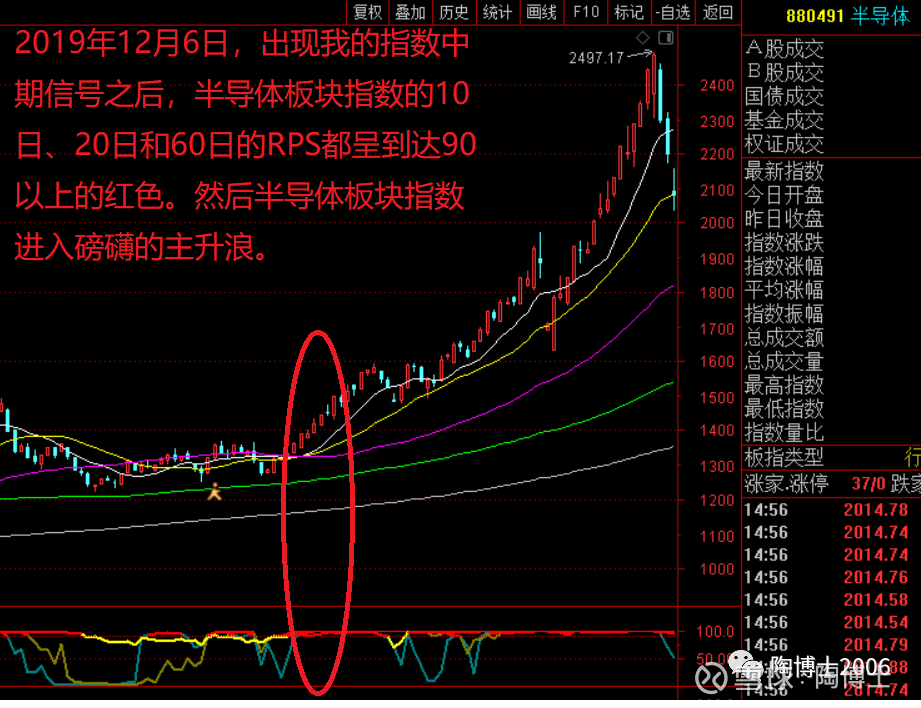 2019年12月6日,出现我的指数中期信号之后,半导体板块指数的10日、20日和60日的RPS都呈到达90以上的红色。然后半导体板块指数进入磅礴的主升浪。如下图: