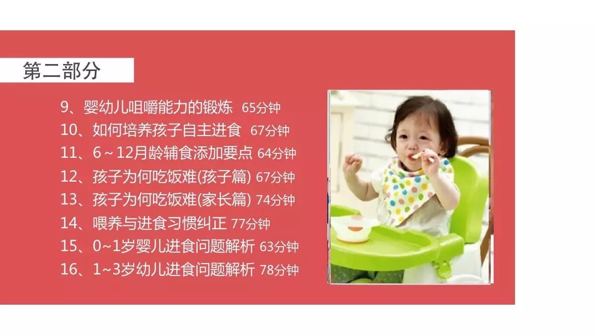 涵盖了辅食添加、食物营养、病期饮食、烹调技巧、进食习惯培养、进餐技能、各月龄喂养问题解析等内容。是0-3岁婴幼儿喂养的系统课程。