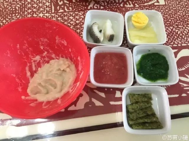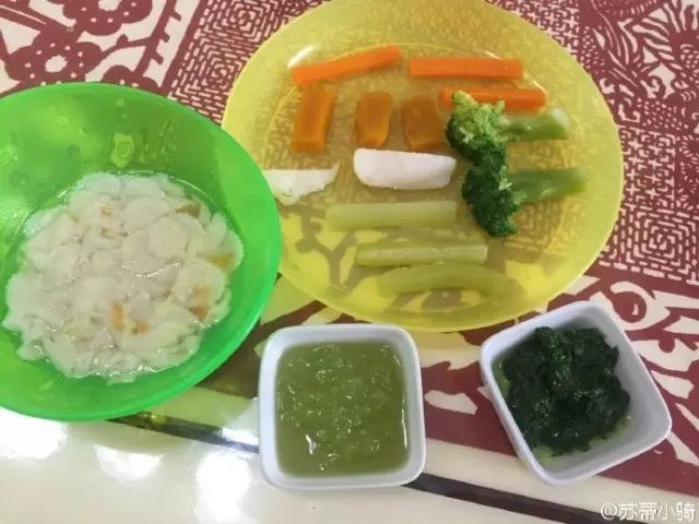 食物舒适区占2/3:米糊,蛋黄,樱桃泥,青菜泥。