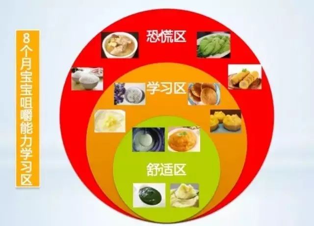 以8个月的宝宝为例,因为从满6个月添加辅食开始已经有一段时间,所以对他而言,泥糊状的米粉、南瓜泥、菠菜泥、鱼泥等食物能轻松吃到,属于“舒适区”。