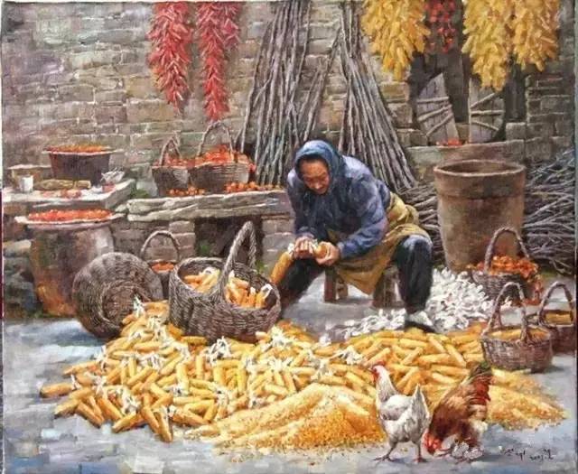 小时候家里的院子,就是这般景象,晾晒的玉米,烧柴的炉子,满院子跑的鸡鸭,画面温暖、热烈,这就是童年的色彩。