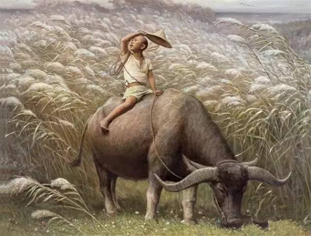 芦苇随风荡漾,放牛的孩子映着夕阳准备回家。