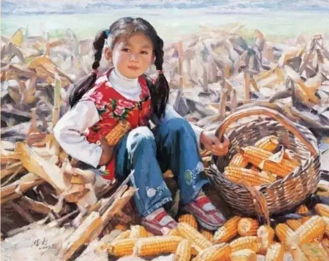 小孩子也提着篮子,坐在玉米杆子上拾玉米。