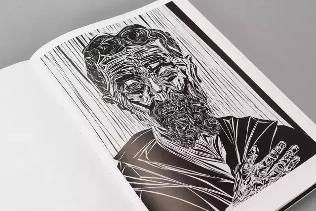 这部黑白刻墨作品合集跨越三个年代,因此全书的主体结构也是由此线索加以布局,并在间隔处穿插画家独特的格言体文字。全书以黑白为基调,充分打造书籍设计的整体性:外观封面为白色艺术纸,书名运用烫透工艺,立面主体一刀,凸显画家作品的个性特质及创作手段,这一特质在扉页及作品结束后的过度页中以不同的方式加以强化。书籍的三面切口喷黑色,地脚的激光雕刻也是强化画家年代纪念集的一个亮点。书体运用了四种不同的纸张,来展现个板块的内容,条例清晰,亦可丰富阅读的变化与节奏。