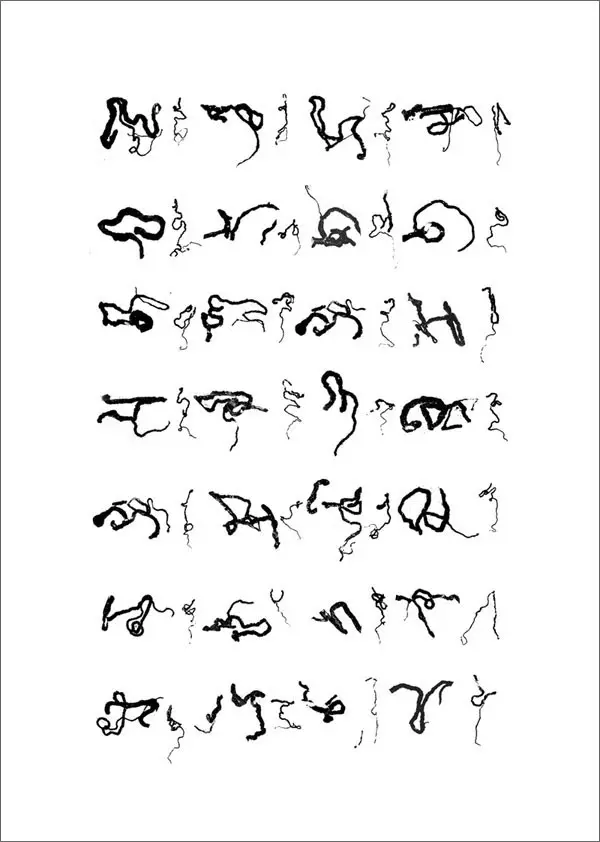 这部新作,主角依然是虫子,但全书无一汉字,不是一部“有关”虫子的作品,而是虫子们自己创作的神奇作品,朱赢椿只是一个发现者、整理者。蜗牛、蚯蚓、椿象等小动物行走过的痕迹,旁人视若无睹,朱赢椿日久凝视,越看越觉得讶异、神奇,仿若一幅幅书法或是山水画,颇费琢磨:潜蝇的行书、蚯蚓的大篆、蜡蝉的工笔、天牛的点皴、瓢虫的焦墨、蜗牛的写意、椿象的飞白、马蜂的狂草……这是造物的神奇,仿佛也是生命的偈语,等待有心者的发现。