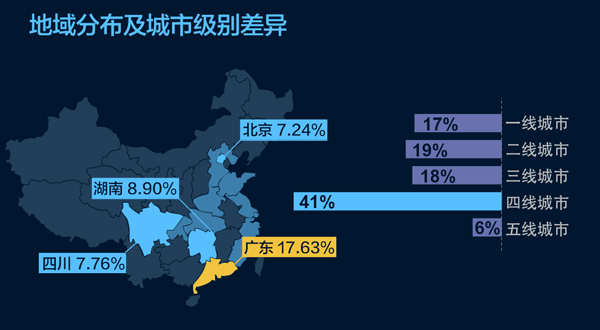 http://mmbiz.qpic.cn/mmbiz/C7mqyYrp6vicmJAdjUNqaFZeaxoM2euz8tHdL4EycXYUGxc5RvXL4m0f4rFU7fFjLKPY2IKibsibZxTwzOVVOZfibQ/640?wxfrom=5综合用户地域分布及城市级别差异分布图,《我是歌手》第三季的用户主要分布在经济较为发达省份的一二线地区,总占比超过54%。值得注意的是,单论城市级别分布,四线城市占比为41%。