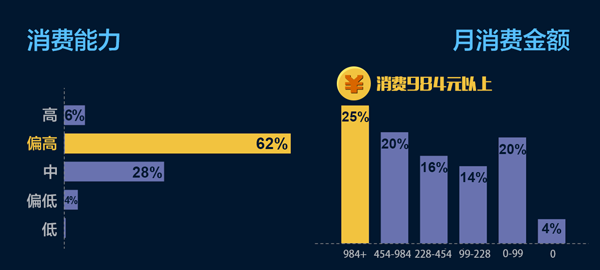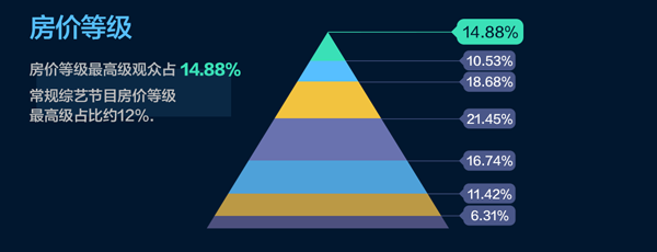 从湖南卫视《我是歌手》第三季播出期间(1.2-3.27)网购消费能力分析图来看,收看该节目用户中68%的消费能力处于偏高以上水平,而从月均消费金额来看,45%的用户月均消费高于454元,其中四分之一用户的月均消费甚至高达984以上。房价等级同样也显示,65.5%的用户房价消费水平不小于第四级,处于中等偏高水平。