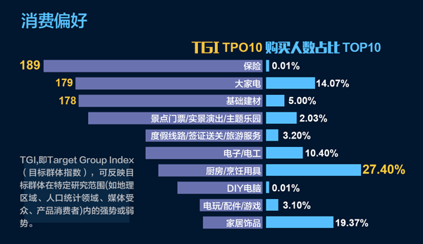 消费偏好TGI数据显示,节目播出三个月内,收看《我是歌手》第三季的用户在保险、大家电、基础建材、各类游玩出行的目标群体中的命中率较高。