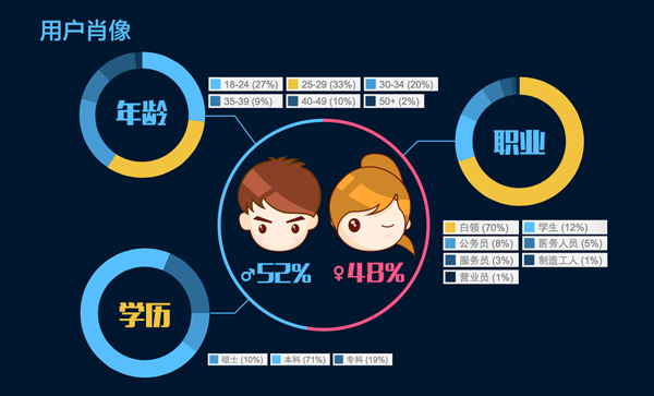 湖南卫视《我是歌手》第三季可谓是男女老少通吃,从用户肖像分布图来看,节目播出三个月内(1.2-3.27),收看该节目的男女人数比例不相上下,其中80%是18-34岁的年轻人群。从学历上来看,有71%的本科生以及10%的研究生,职业方面,“白骨精”们以70%的超高占比秒杀,学生和公务员屈居第二三位。