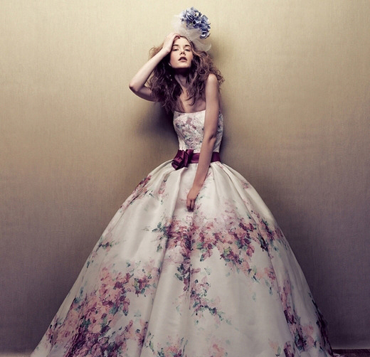 剪裁合身的缎面婚纱上铺满玫红色的花团,繁花似锦,生机勃勃。