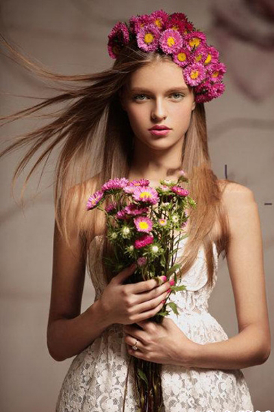 紫色的小雏菊随意地盛开在新娘散落的头发上,此时的新娘不就是一位花仙子吗!