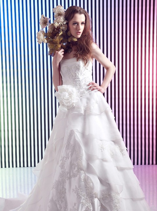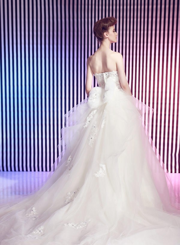 立体花饰是2010年超级流行的婚纱装饰设计之一,造型夸张的花朵自然地系在新娘的腰间,使视线转移在颇具时尚感的花饰之上,巧妙地弥补了新娘腰身粗壮的缺陷。这款婚纱选择了极简主义的抹胸款式,有效地延伸新娘颈部美感,同时将新娘的性感时尚展露地淋漓尽致;曼妙细腻的手工刺绣更为婚纱增添几分灵动之美,配合腰间夸张大胆的立体花饰设计,优雅而不失可爱之感,打造出新娘完美修长的身材。
