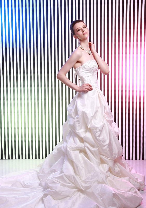 时下流行的塔夫绸手抓褶颇具奢华的宫廷感觉,错落有致的褶皱仿佛灵动的音符跳跃在新娘的裙摆之上,硕大膨起的裙摆与腰部的贴合设计形成悬殊的对比,玲珑的腰身在对比中更显纤细,这款婚纱别具宫廷神韵,品味不俗的你值得拥有。