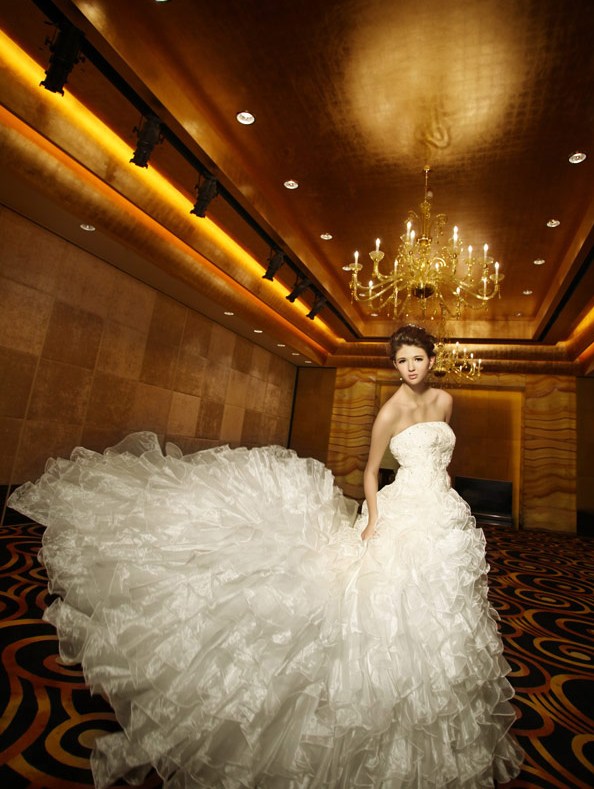 拖尾婚纱具有拉伸新娘下半身线条的特殊魅力,合适的拖尾裙摆可以使新娘身材更显修长。豪华复杂的荷叶边裙摆装饰另拖尾更具有优雅的欧式风格,细腰与裙摆的悬殊对比中,完美身材展露无遗。