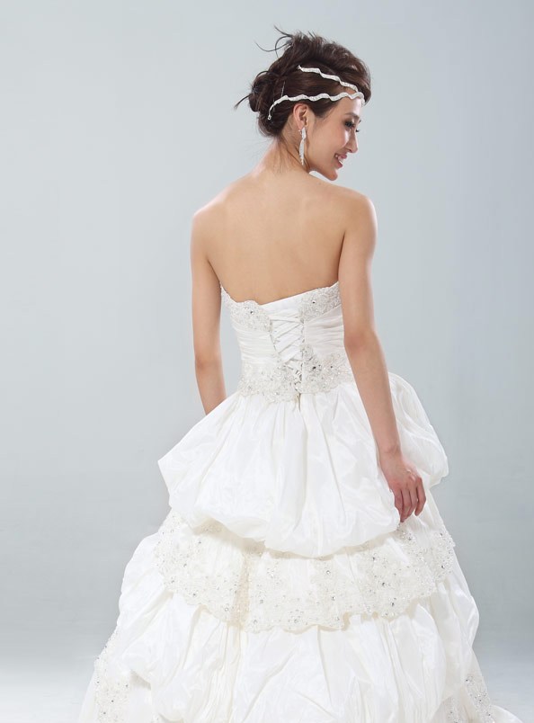 显瘦婚纱:后绑带式腰部设计+褶皱塔式裙摆