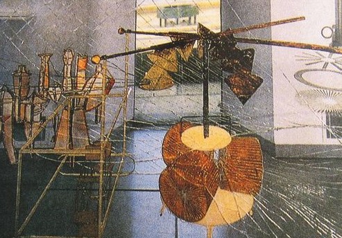 5、甚至新娘也被光棍汉们剥光了衣服 杜尚 1915—1923年 装置艺术(铅箔、银箔、油彩、玻璃)。
