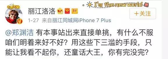 小青(ID:youthzqw)了解到,原来是因为一些网友发现,近期曝出的“丽江女子被暴打”事件的发生时间和郑渊洁发微博的时间似乎有重合,因此又旧事重提并@了郑渊洁。同时,微博实名认证为丽江同城网总编辑的“@丽江洛洛”发微博用“下三滥”等侮辱性词汇挑衅郑渊洁,郑渊洁告诉小青,这“将一次善意的发表意见改变性质变成对峙”。