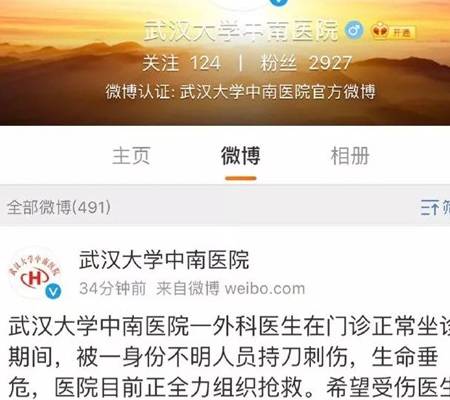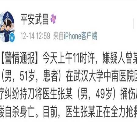 然而,就在这两天,这种事情又再次发生,给本来就不和谐的医患关系又蒙上了一层暗纱。十二月十四日上午十点多,在武汉大学中南医院1号楼4楼外科,一个男子用刀刺伤了一个正在坐诊的医生,随后自己跳下楼当场死亡。目前,这名外科医生因为伤势较重还在抢救。