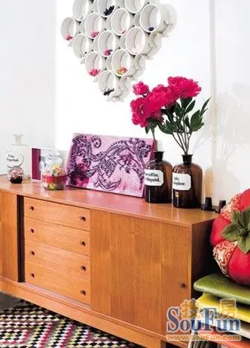 在这个现代风格的角落中,来点中西合璧也很有意思,中式丝绸打造的南瓜靠垫是很好玩的礼物,在几何图案的地毯映衬下格外有趣。