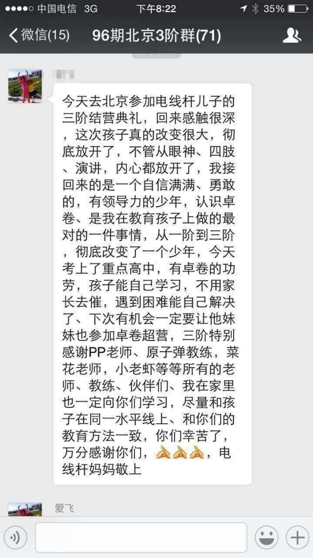 92期北京营、93期成都营、94期深圳营、95期福州营的家长朋友们,结营典礼结束后的这两日,是不是已经感受到孩子的巨大变化?千万不要吝啬您的赞扬和鼓励,孩子每一分的进步,都需要及时肯定和鼓励,请您也像卓卷的导师们一样,时常向您的孩子竖起大拇指,让孩子及时知道他得到了您的认可,让他从做的正确的地方得到自信和成就感,这样孩子才会向正确的方向,变的越来越好。