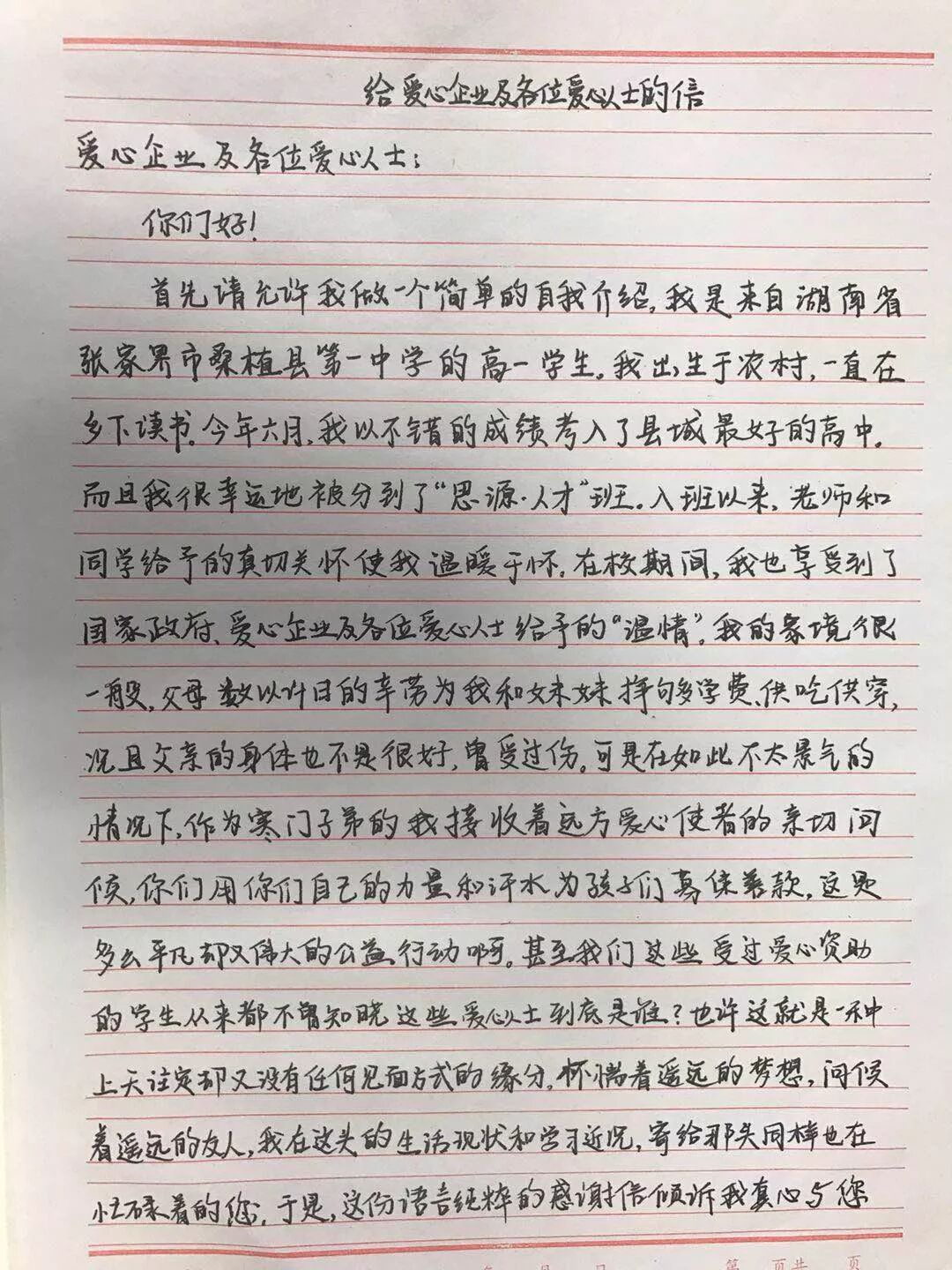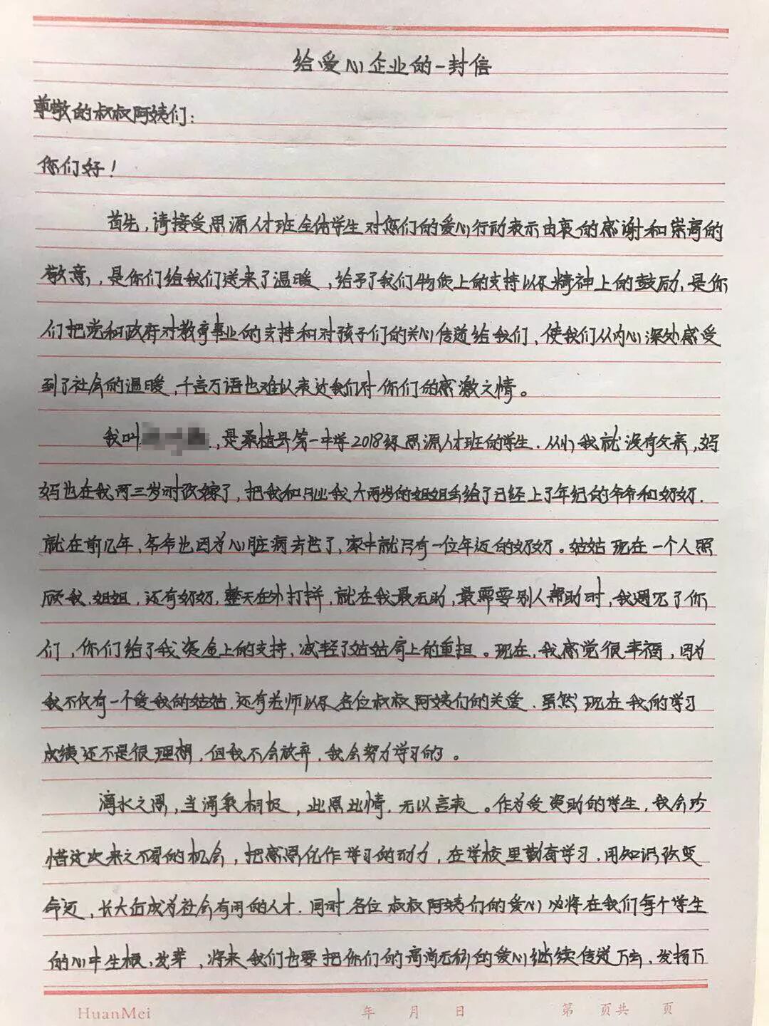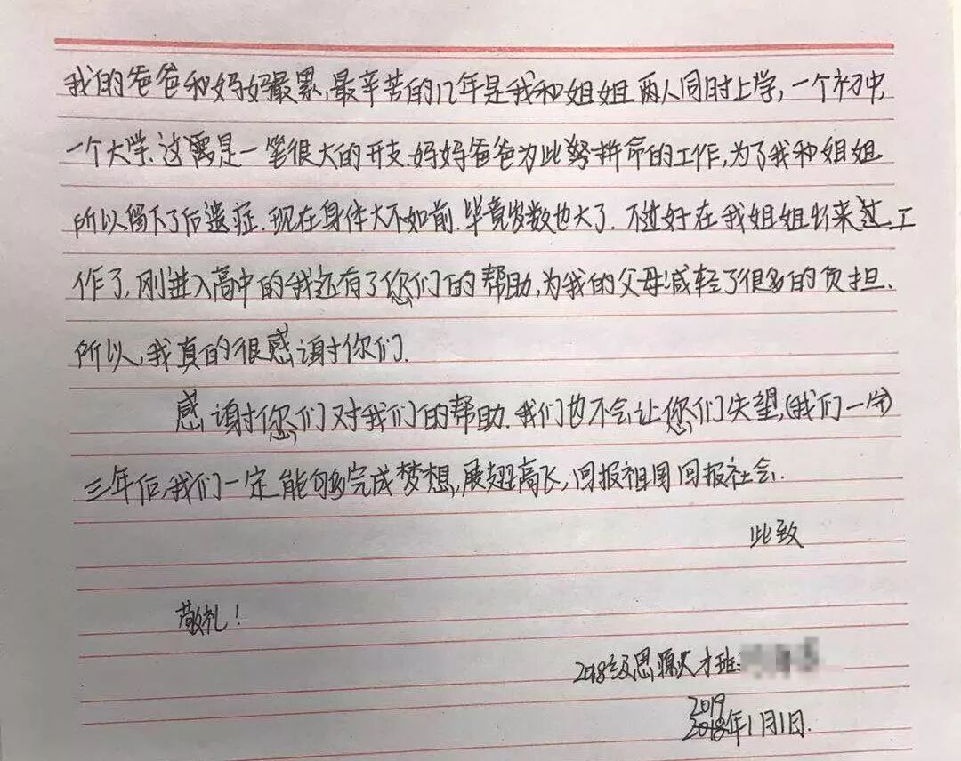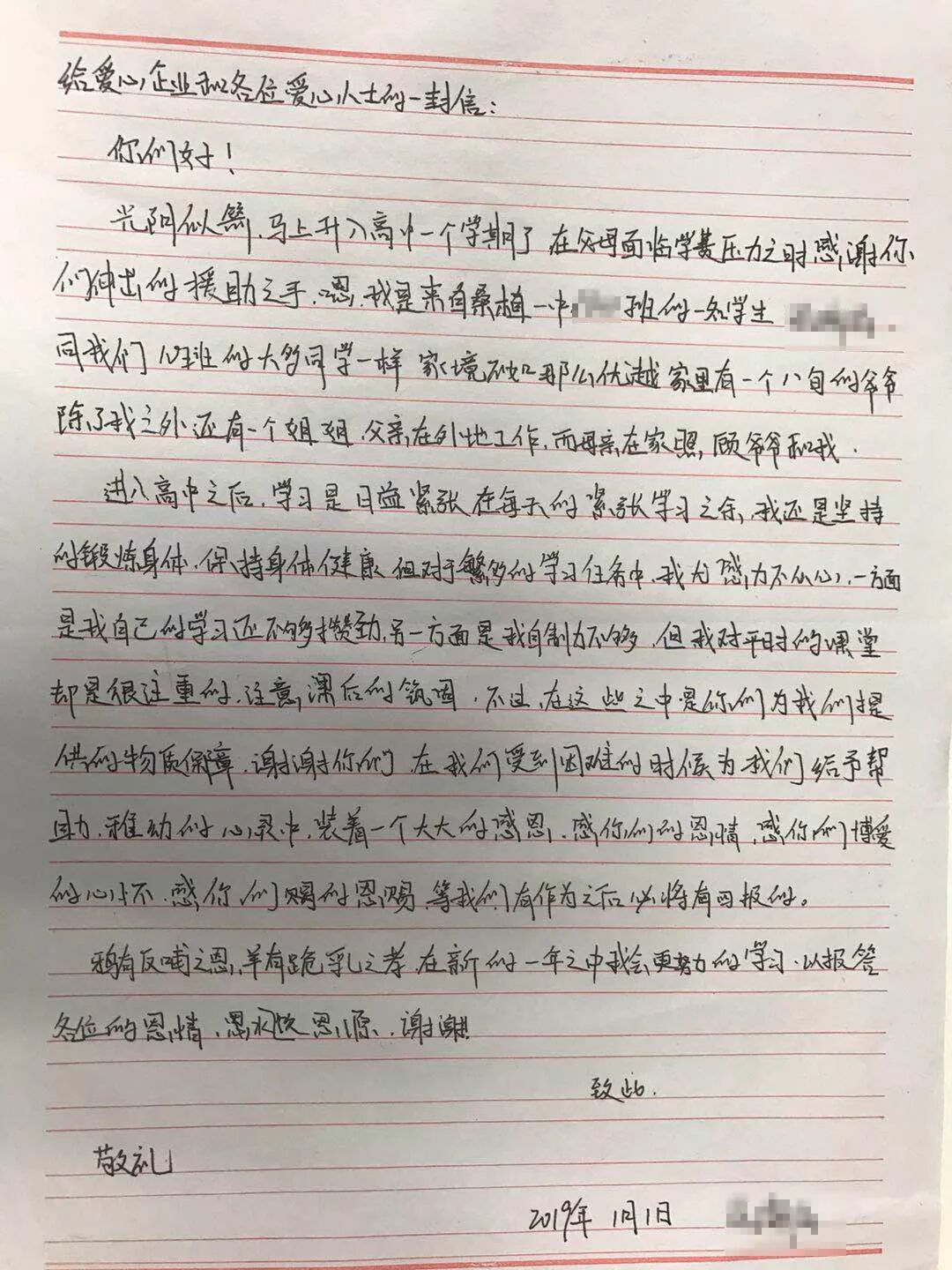 再此,感谢孩子们的来信,希望所有受助的孩子们能通过自己的努力,以积极乐观的态度面对生活,挑战未来,感恩他人,回报社会。