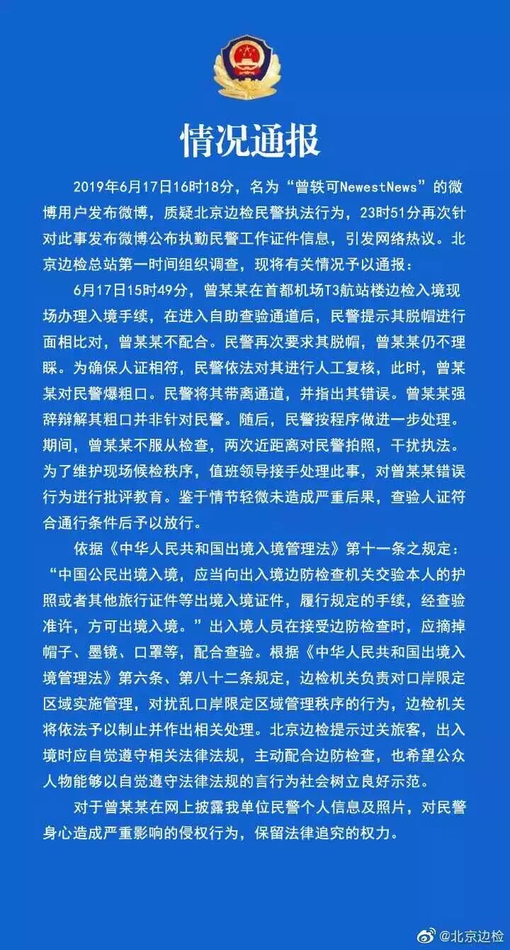 北京边检正面回应了此事,并保留追究曾轶可法律责任的权力: