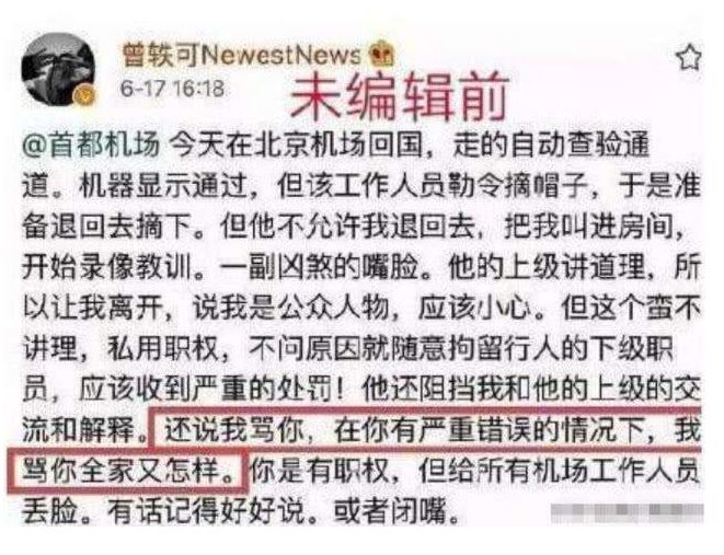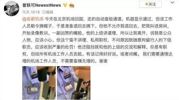 曾轶可这一系列令人惊讶的操作,只因为这位边检警员要求她入关的时候摘帽检查,她便开口骂人。