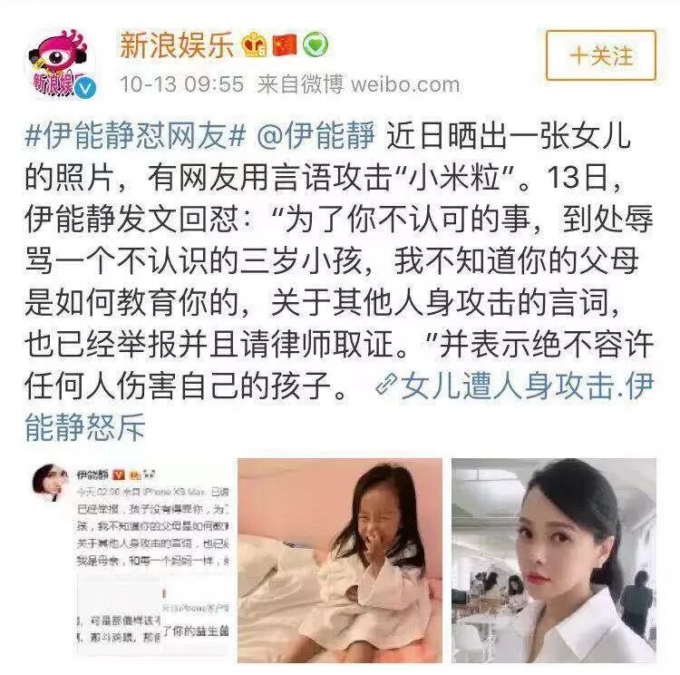 10月13日,伊能静为了女儿怒怼网友的微博窜上了热搜: