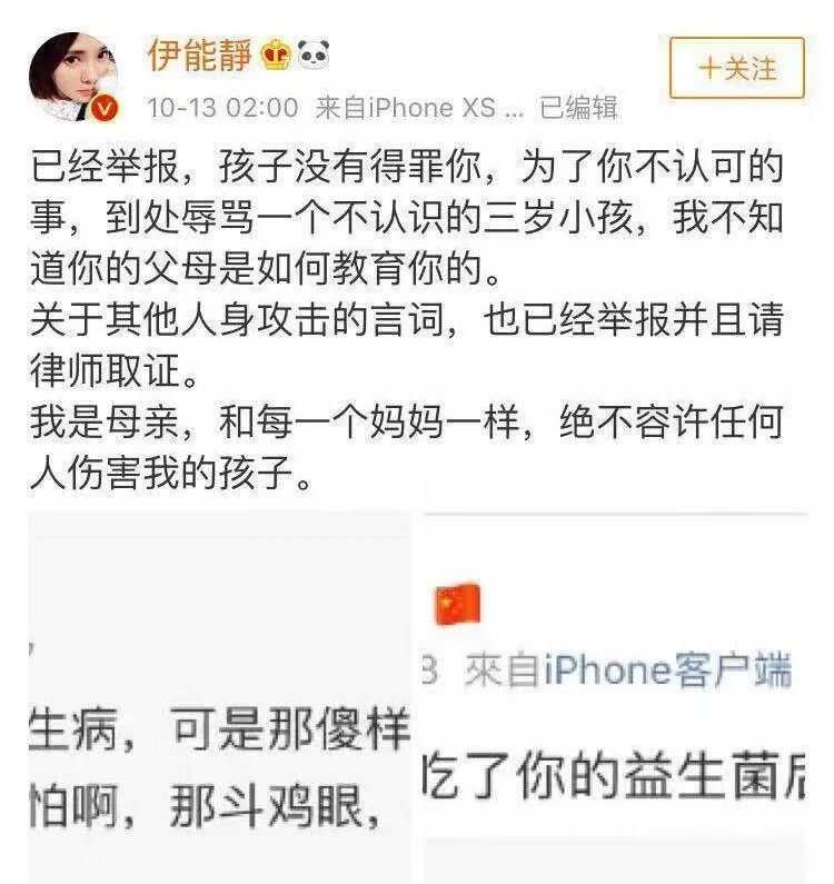 随后伊能静在微博中点名道姓地晒出了两位网友的图片,并声称不允许任何人伤害的我的孩子......