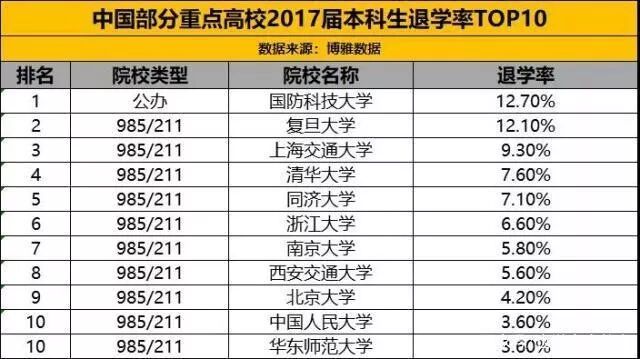 国防国际大学和复旦大学,退学率分别为12.7%和12.1%,也就是说每10人中就有1人被学校勒令退学