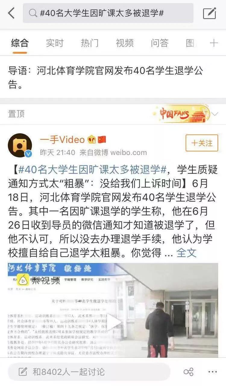 今天,河北体育学院40名大学生被退学维权的新闻上了热搜。