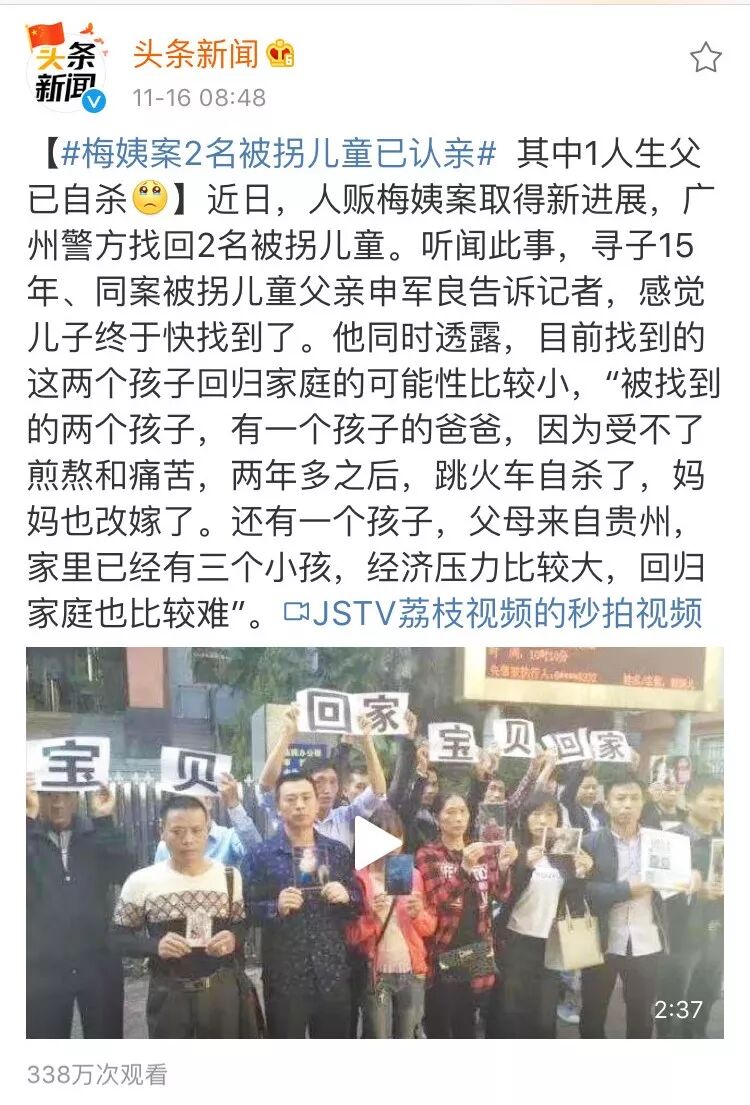 其中一名找回儿童的父亲,因受不了孩子被拐的痛苦和煎熬而自杀。
