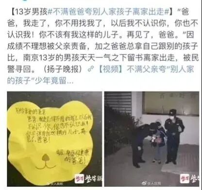 于是,她回到家里,变成了现在这般令外人不齿的“啃老族”。其实,最让我动容的是女儿说的那句:“剪了我的翅膀,却还怪我不会飞翔。”这句话似乎喊出了很多孩子内心深处,对父母多年畸形教育的憎恨。而他们的父母还在疑惑,为何多年的“用心”教育,却教出了一个充满仇恨、近乎废柴的孩子。殊不知,每一个被“养废了”的孩子背后,都必然站着一对,信奉打压式教育的父母。然后父母却不指这种教育方式带来的后果。知乎上曾有一个这样的问题:父母的“打压式教育”长大的孩子都怎么样了?其中一个高赞回答是:自卑却要强,内心脆弱,自我否定,做任何事都有无力感,半途而废的事情数不胜数。什么人都比我强,我永远是最烂的那一个。从他的字行间,看到了心酸,打压式父母带来的痛苦,刺入骨髓,融进血液。这种“打压式教育”,让很多人从小自卑,缺乏自信,没有安全感的度过一生。 我们仔细回想下,在生活中有没有对孩子说过这样的话:“你这字怎么写的这么难看,简直是屎壳郎爬的一样。”“同样都是一个老师教的,你怎么就不行。”“连个头都不如别人家孩子长得快。”面对父母错误的表达方式,我相信大多数孩子选择了忍耐,但不乏有个别孩子走向了极端。我依稀记得,有个13岁男孩因离家出走的原因登上热搜。家住南京的13岁男孩离家出走了,幸运的是民警经过一个多小时的努力找到了他,这才避免了一场悲剧的发生。男孩向民警诉说了自己的“伤心事”:“爸爸觉得我这不行那不行,他不喜欢我,我就走。”孩子临走前,还不忘贴心地给爸爸留下便条,上面写道:“亲爱的爸爸,你不用找我了。以后你不认识我,我也不认识你。你不该有我这样的儿子,再见了爸爸。”虽然寥寥数语,但足以表达天天的决绝。 或许,在男孩父母的眼中,自家的孩子距离“优秀”,永远都是那么遥不可及,而一句“你不行”像一座大山,压得他喘不过气来。在这样的环境下成长的孩子,渐渐失去正确的对错认知,变得只会看父母的脸色,依照父母的心情,判断事情能不能做、做得好不好。这种阴影,或许还会伴随孩子的一生,久而久之,孩子会变得越来越自卑、胆怯,甚至在别人面前抬不起头。而这在父母眼里,所谓“用心良苦”的教育,却在慢慢的,压碎他的自信,压垮他的梦想。究其原因,并不是孩子能力“不行”,而是父母教育“不对”。作为父母,看到的只是来自于孩子的差异,却看不到自己与优秀孩子的父母也有差异。孩子再小,也是独立存在的个体。内心有自尊,脸上有骄傲。我们培养孩子不是为了面子,而是让他们成为人格独立,在未来能够独立前行的自己。 所以,让打压式教育就此停止吧!孩子的成长,需要那你的这些爱的。1、教育孩子,要重视他的感受有人说,家之所以温暖,亲人之所以成为亲人,是因为我们之间可以多讲情少讲理。我觉得这句话说得特别好。父母对孩子的教育主要应该体现在情感方面,多关注情绪,少评判是非对错;多一些交流和了解,少一些否定和打击。如果我们都不能包容孩子的错误,这个世界谁还能包容他?能用一个拥抱解决的事,何必大动肝火呢?试着蹲下来,倾听孩子的内心。2、教育孩子,不要吝啬你的赞美心理学家威廉·詹姆斯说:“人类最深处的需要,就是感觉被人欣赏。” 孩子也是如此。每个孩子都想听到来自父母的正向赞扬。赞美并不是浮于表面的夸奖。家长应鼓励孩子每一个进步,鼓励孩子付出的每一个细节,肯定孩子付出的过程而不是结果才是孩子真正需要的。父母的赞美,孩子在未来的路上才能走得更加自信。