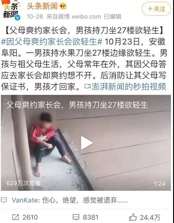 去年十月份,在安徽阜阳,一个男孩手持水果刀爬上27楼想要轻生。孩子想不开,坐在27楼边缘犹豫了很久,最后经消防员反复劝说: