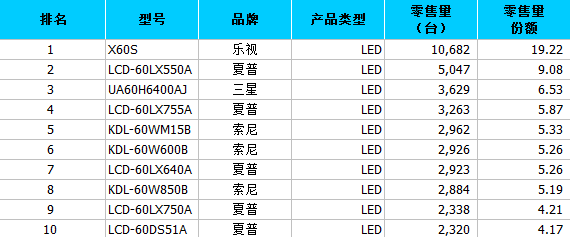 (数据来源:中怡康数据监测,2014年8月份60寸彩电畅销型号)