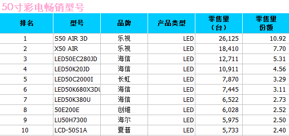 (数据来源:中怡康数据监测,2014年8月份50寸彩电畅销型号)