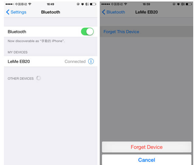 LeMe耳机使用蓝牙4.0标准,可以兼容大多数的蓝牙终端。与ios设备连接之后,会在蓝牙旁边显示耳机电量,android设备还没有普遍支持这个功能。