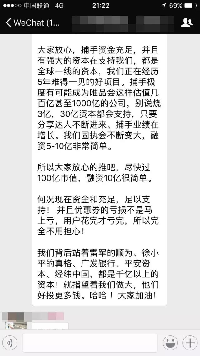大家放心,捕手资金充足,并且有强大的资本在支持我们,都是全球一线的资本,我们正在经历5年难得一见的好项目。捕手极度有可能成为唯品会这样估值几百亿甚至1000亿的公司,别说烧3亿,30亿资本都会支持,只要分享达人不断进来、捕手业绩在增长。我们固执会不断变大,融资5-10亿非常简单。