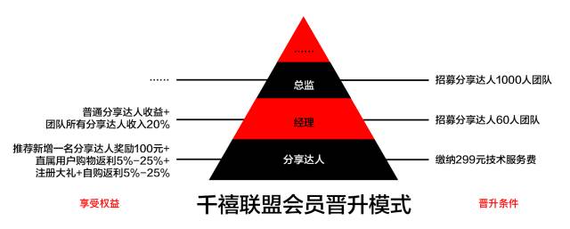 首先必须缴纳299元技术服务费,才有资格成为平台的永久会员,其中会匹配给会员各种返利、优惠以及分享的权益,其次,达到分享推荐的条件后将逐步晋升,相应的权益匹配也更为优厚。毋庸置疑,晋升的难度将会越来越大。